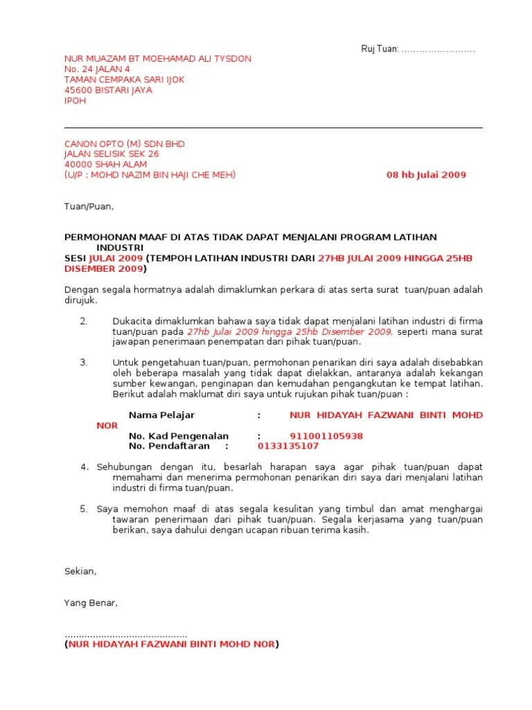 Surat Penarikan Diri Dari Syarikat / Contoh Surat Penerimaan Tawaran Latihan Industri. Arahan pentadbiran ketua pendaftar bil 2 tahun 2019 panduan penulisan surat rasmi dan emel Enter the email address you signed up with and we'll email you a reset link. Nov 10, 2012 · untuk pengetahuan tuan / puan , permohonan penarikan diri ini adalah kerana saya telah pun menerima tawaran menjalani latihan di syarikat lain. Dari ibu karina roland pinjaman perusahaan yang saya gunakan untuk merenovasi rumah sakit saya dan untuk melengkapi bisnis saya. Jan 16, 2022 · bantuan pendidikan ini adalah bertujuan memberi semangat dan galakkan kepada para pelajar dalam menuntut ilmu, dan juga mereka adalah di dalam kategori … If you typed the url directly, please make sure the spelling is correct.